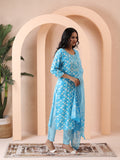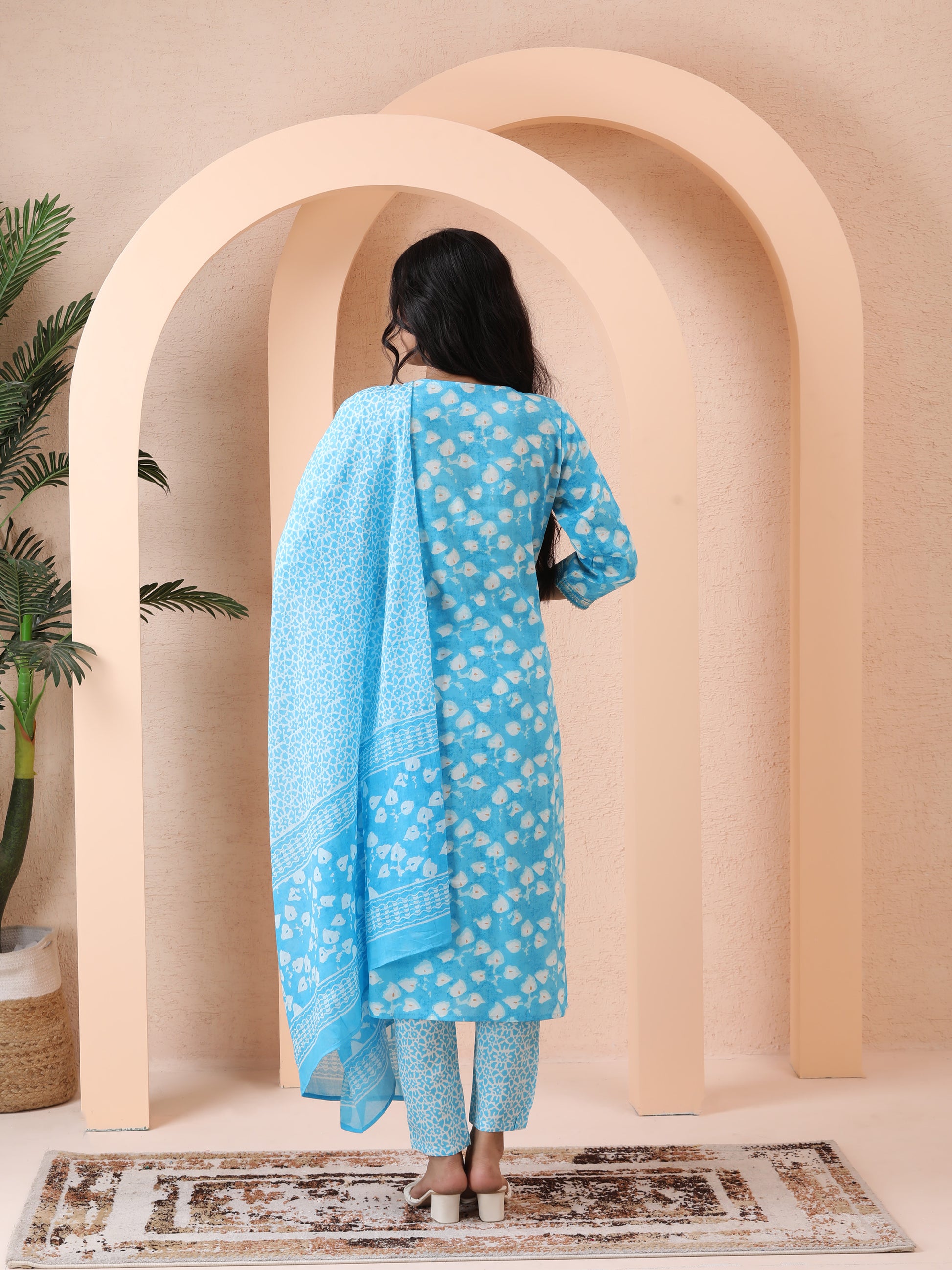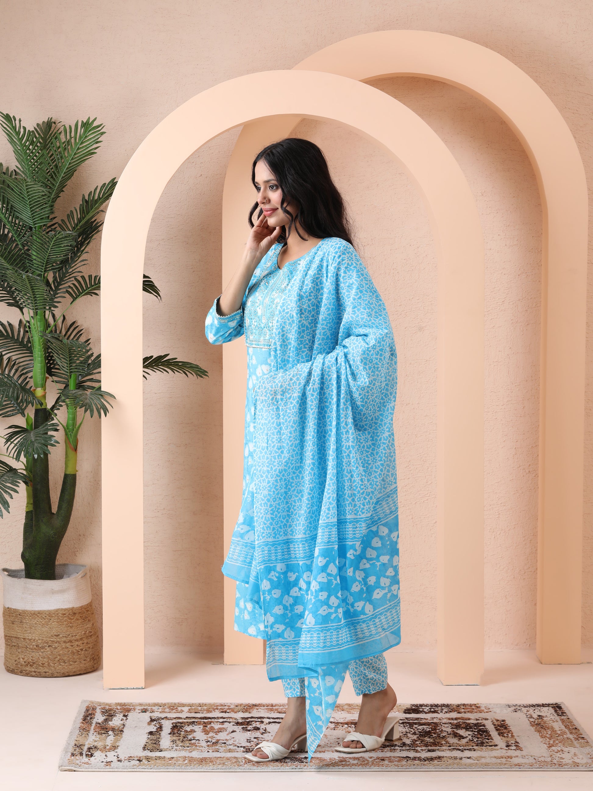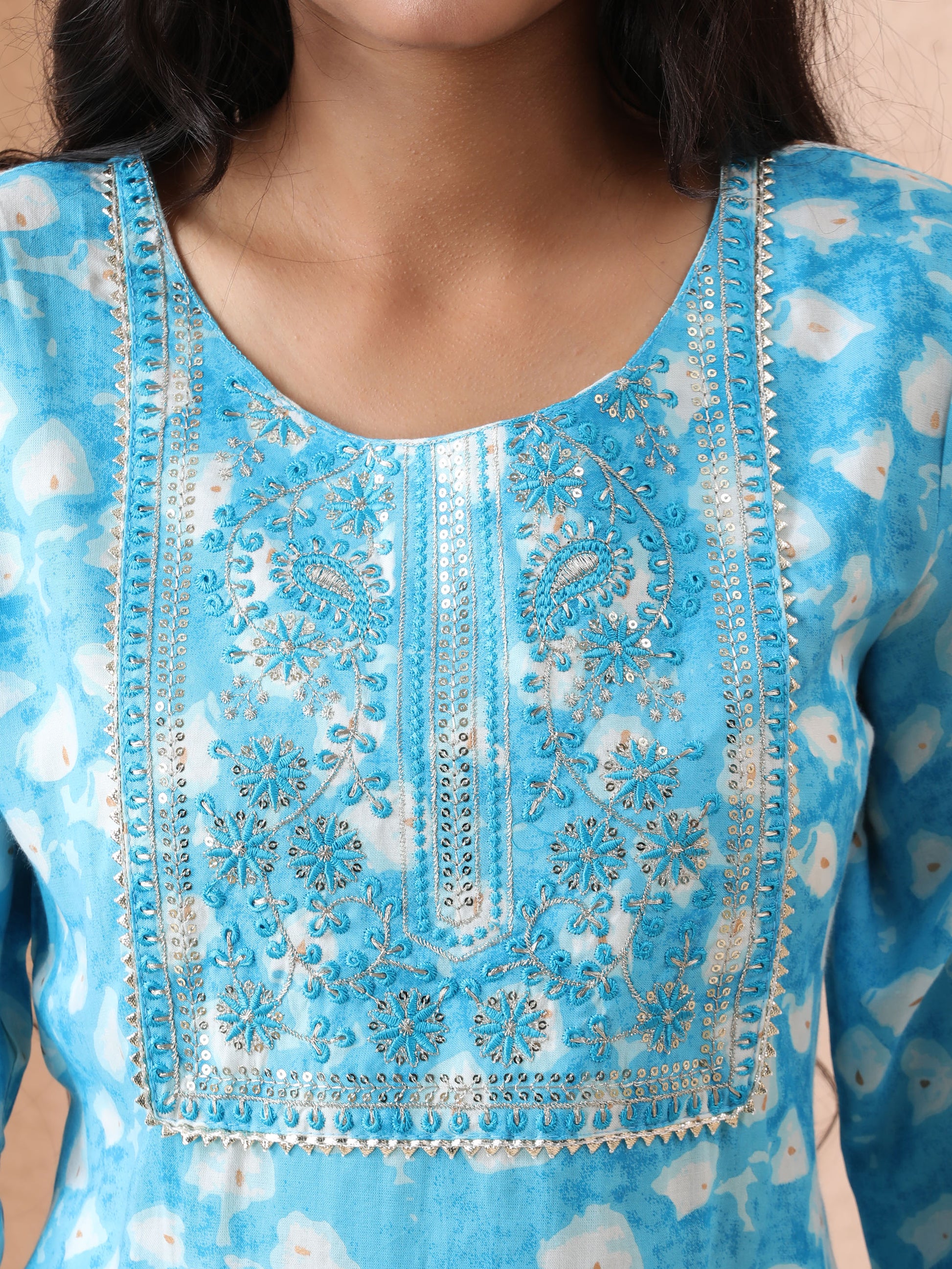 Bask in the serene beauty of the Varnnan Sky Whisper Kurti Set, a harmonious blend of sky blue and white that captures the calm of clear skies and soft breezes. Crafted from breathable, high-quality cotton, this A-line calf-length kurti features delicate white floral prints and a finely embroidered round neckline, offering a graceful ethnic finish.