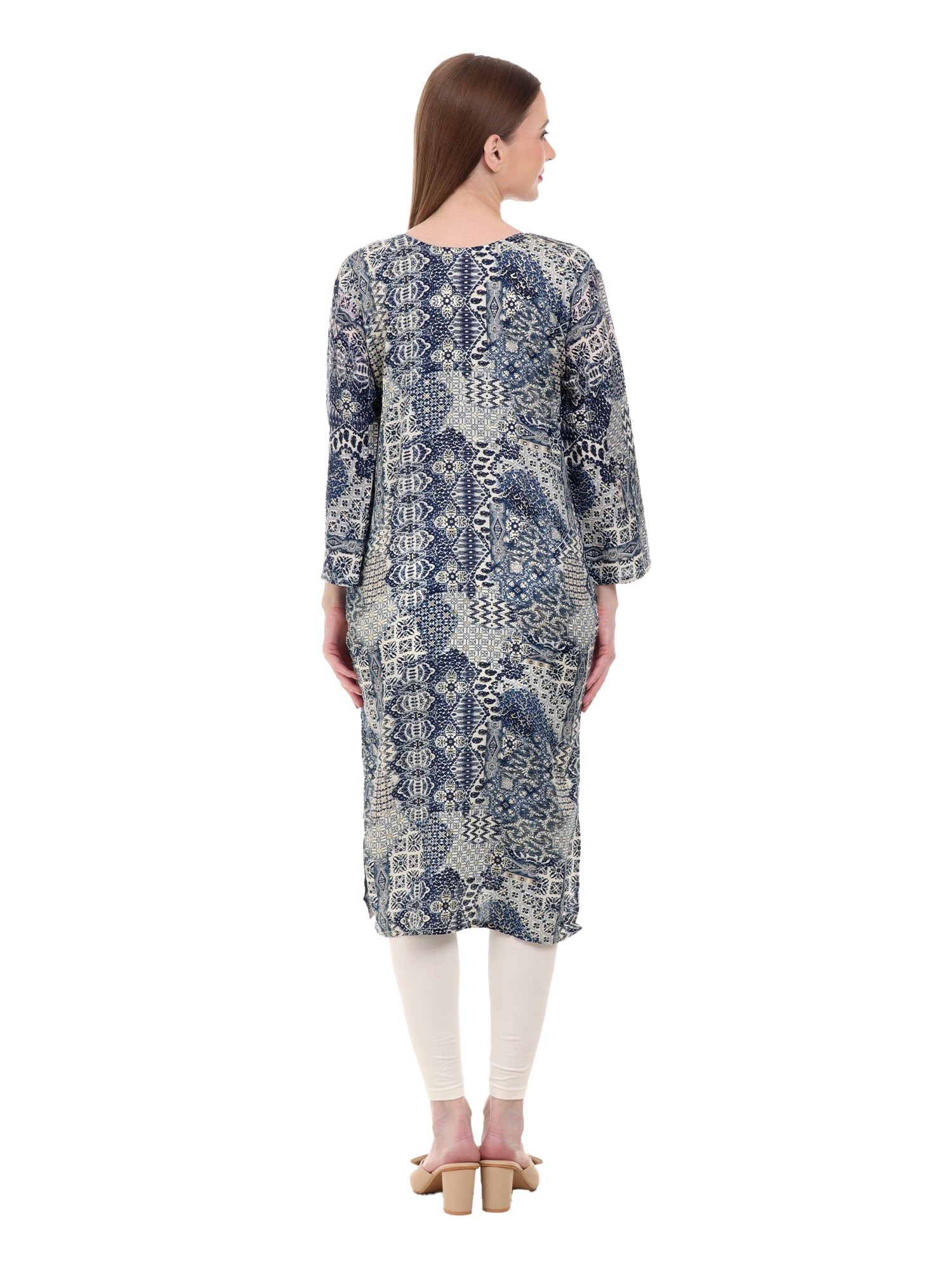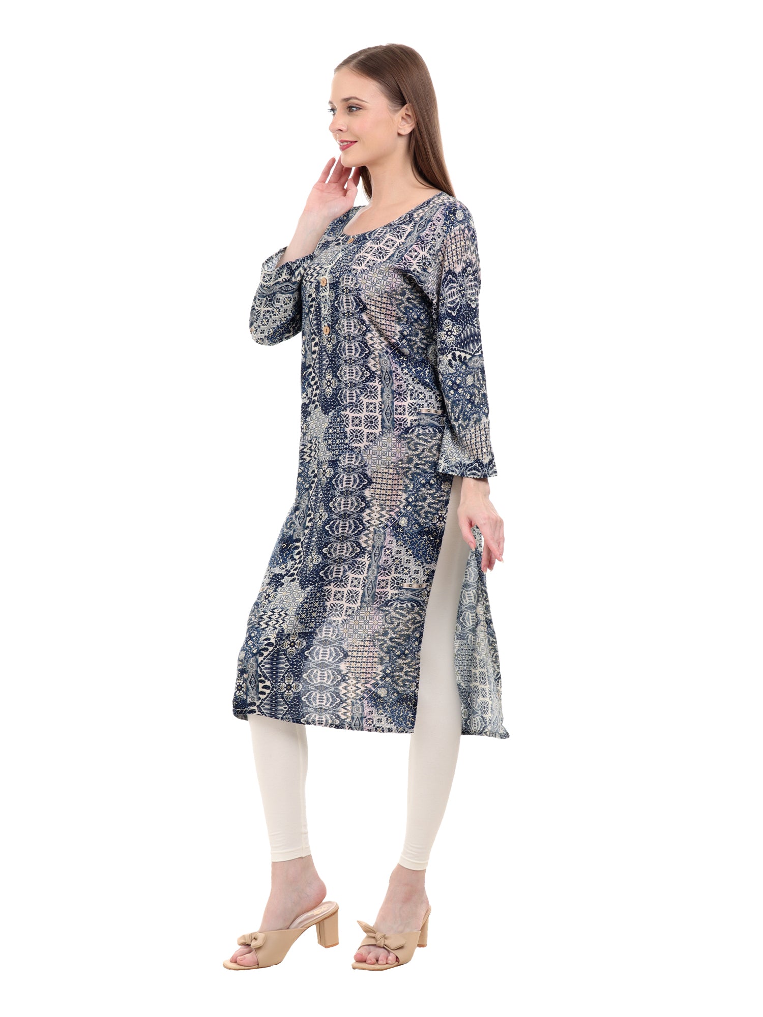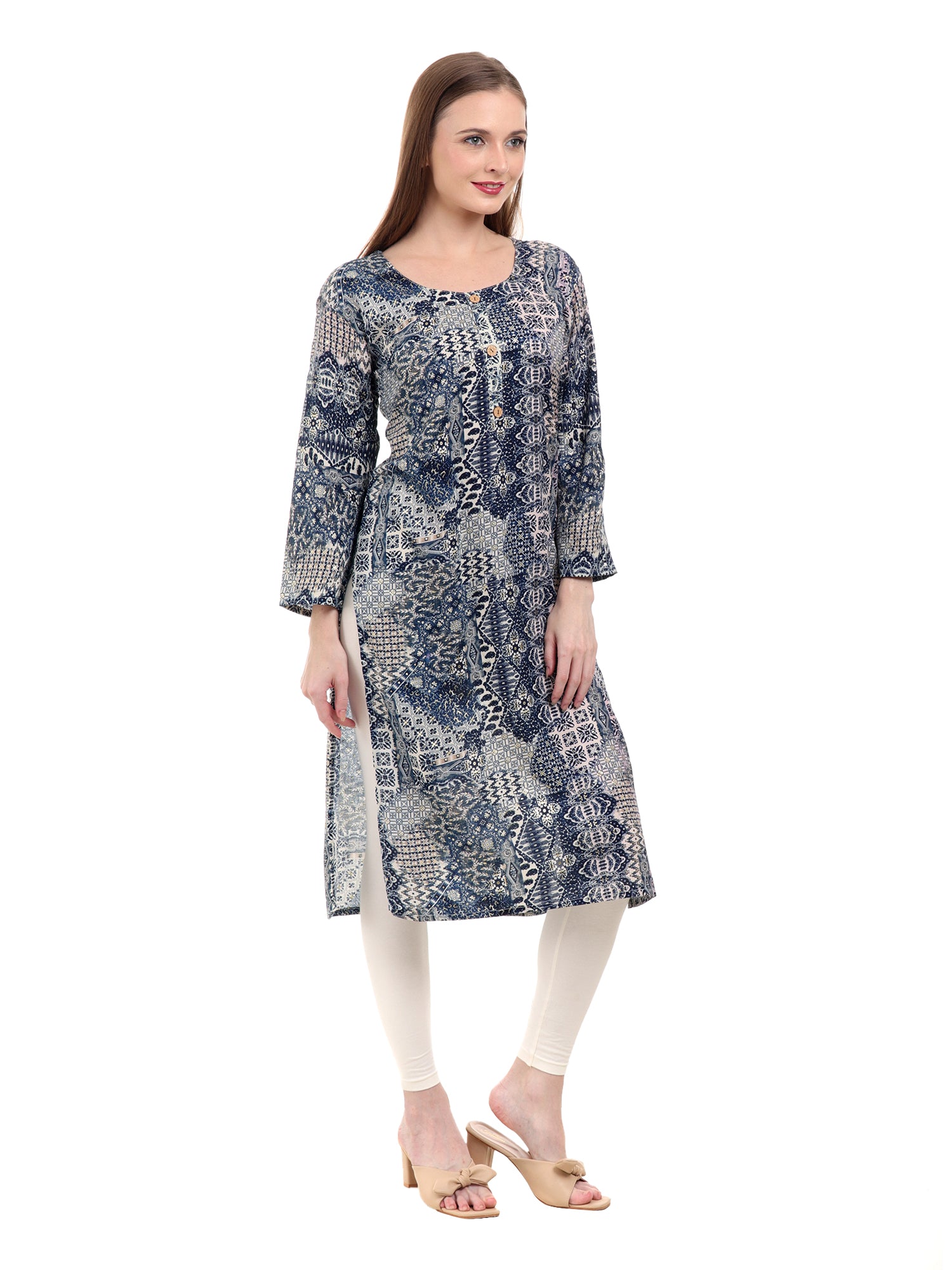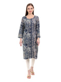 Elevate your ethnic wardrobe with Varnnan's exquisite blue kurti, adorned with intricate golden prints that exude timeless charm. Crafted in a flattering A-line silhouette, this calf-length kurti offers both style and comfort, making it a perfect choice for various occasions.