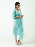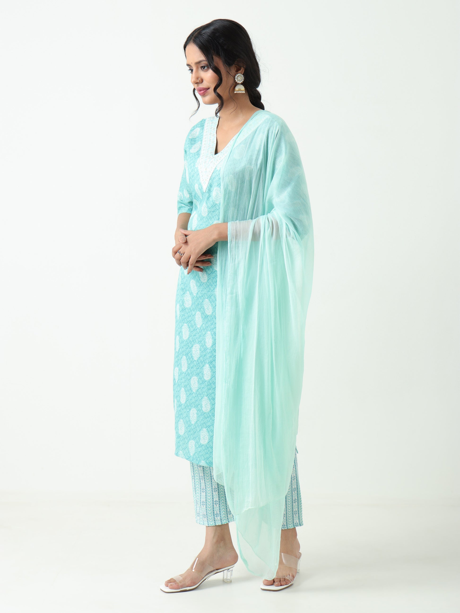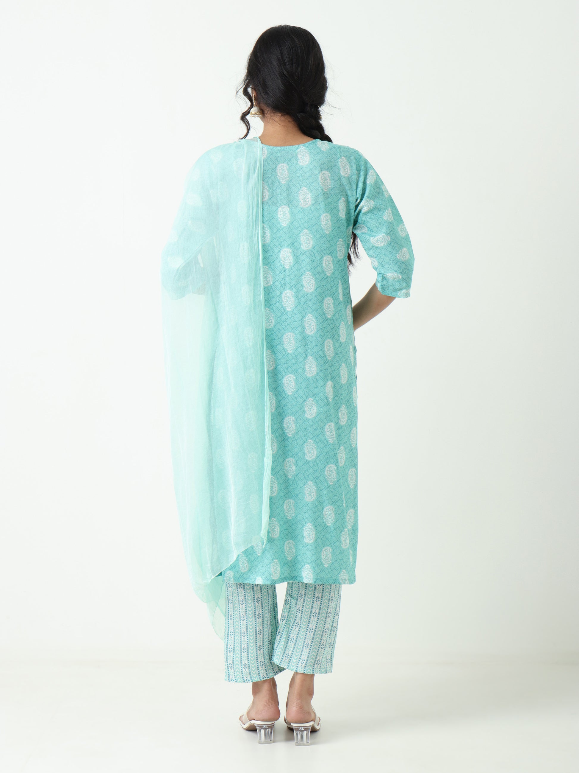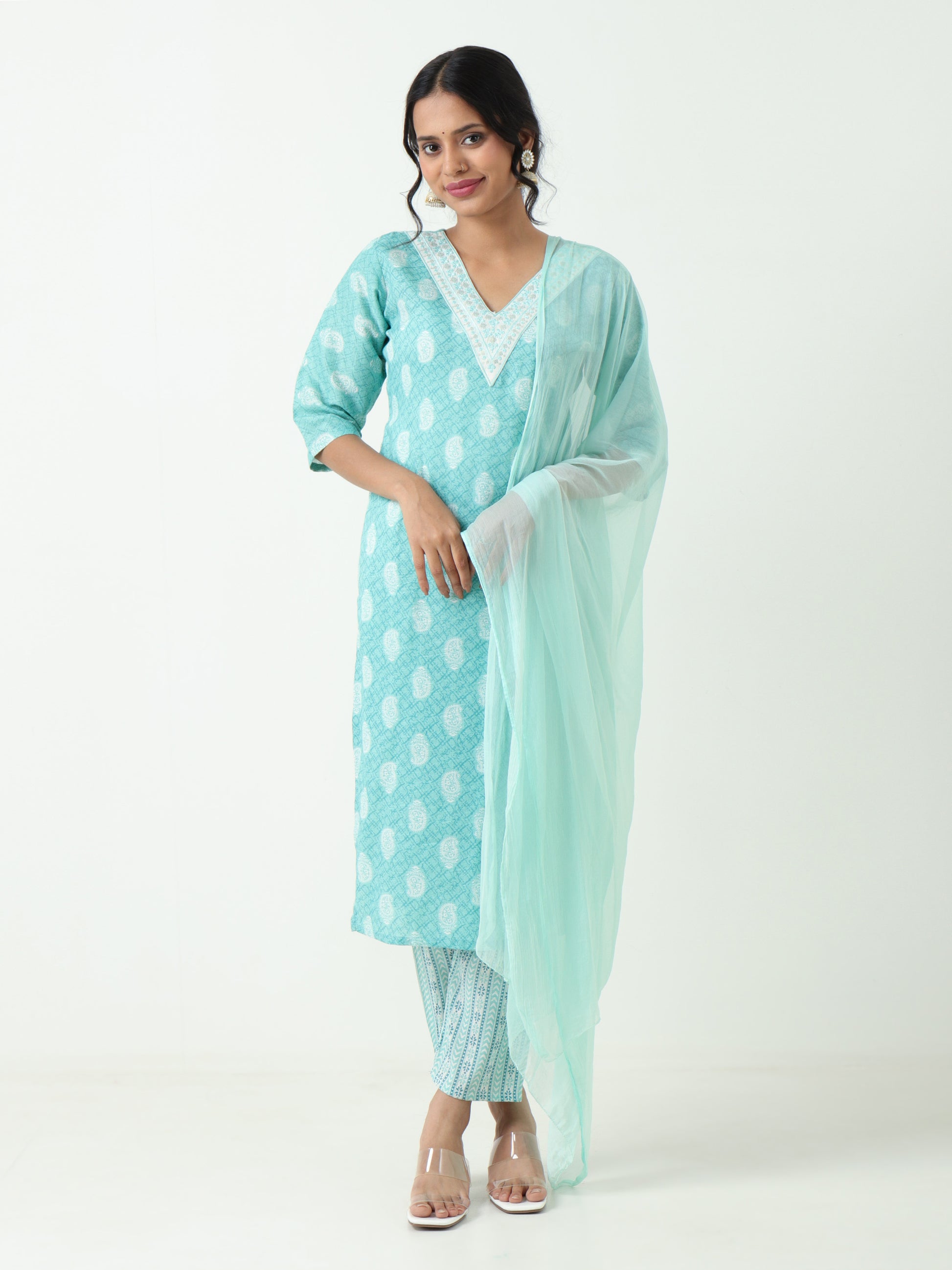 Featuring three-quarter sleeves for comfort and ease, this kurti is paired with a matching bottom wear and dupatta, completing a look that is light, airy, and effortlessly graceful. Whether for a casual brunch, festive morning, or a relaxed day out, the Sky Serenity Set brings a cooling sense of sophistication to your summer wardrobe.
