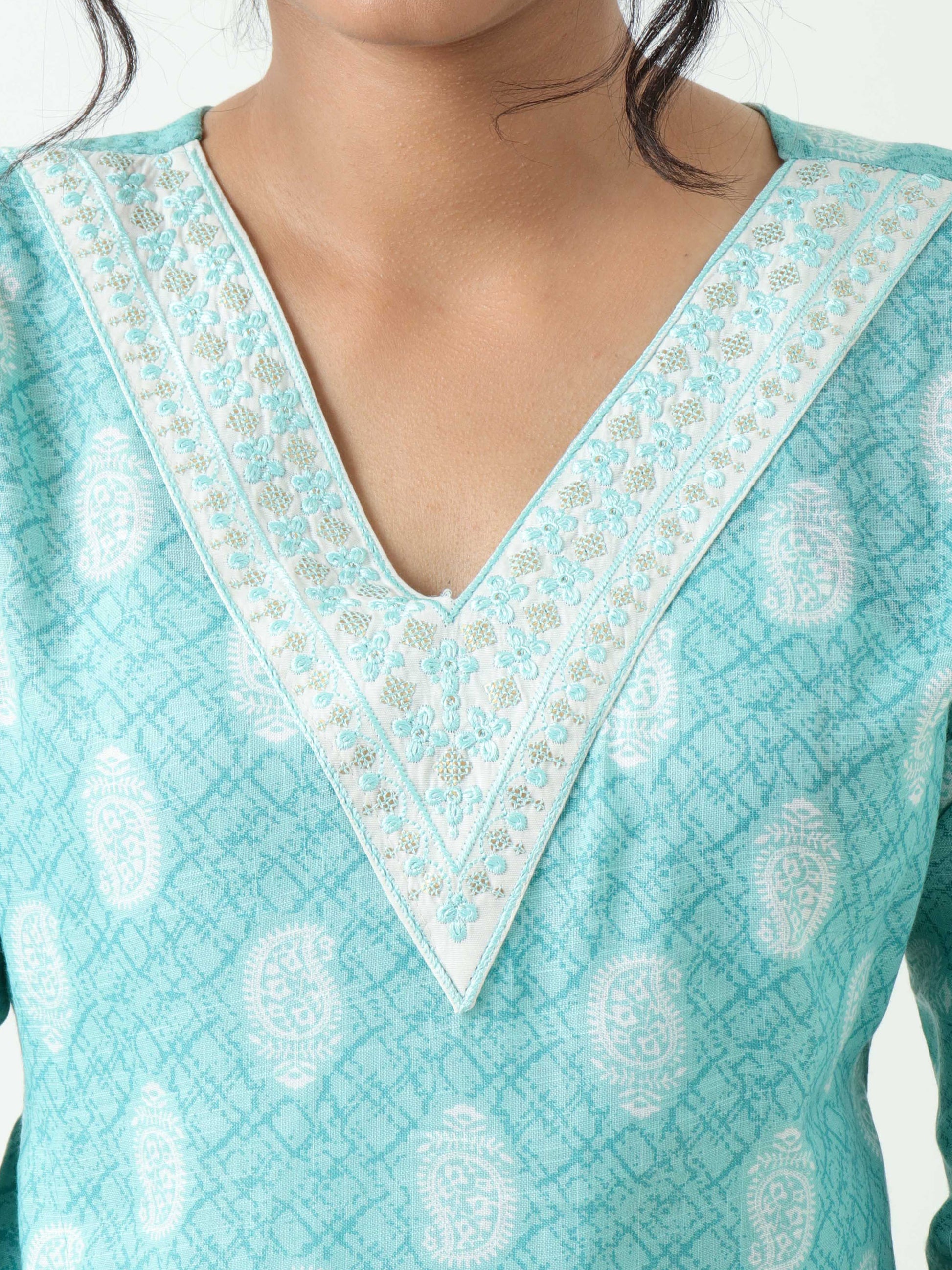Crafted in soft, breathable cotton, this A-line calf-length kurti is a refreshing blend of sky blue and white hues, ideal for warm, sunny days. The delicate all-over print pairs beautifully with a V-neckline adorned in subtle lace detailing, adding a touch of refined charm to your everyday style.