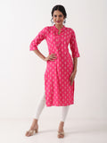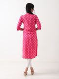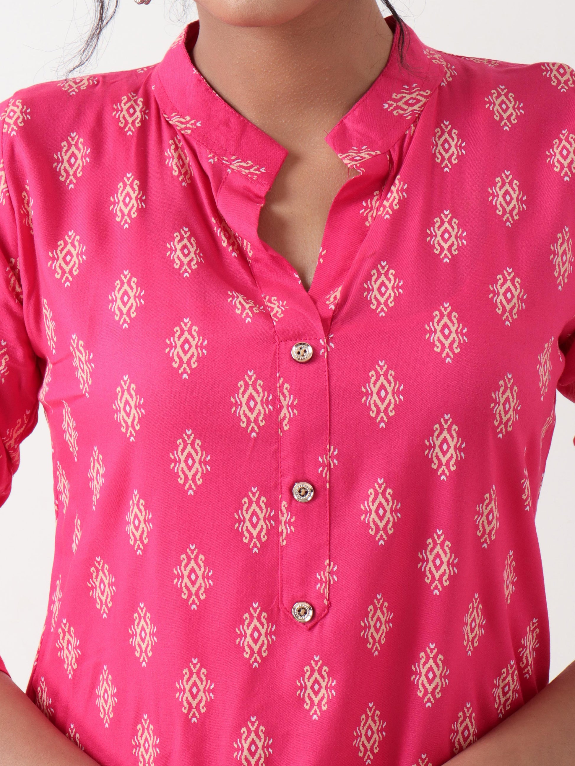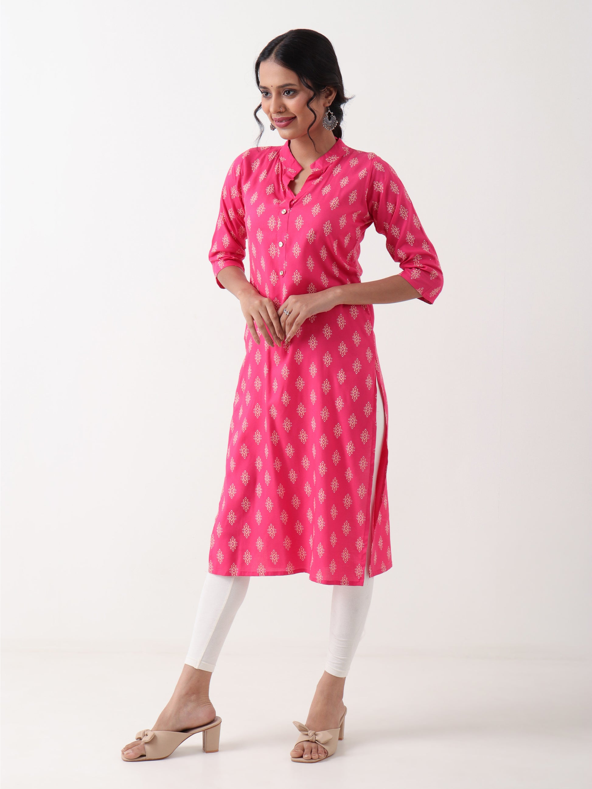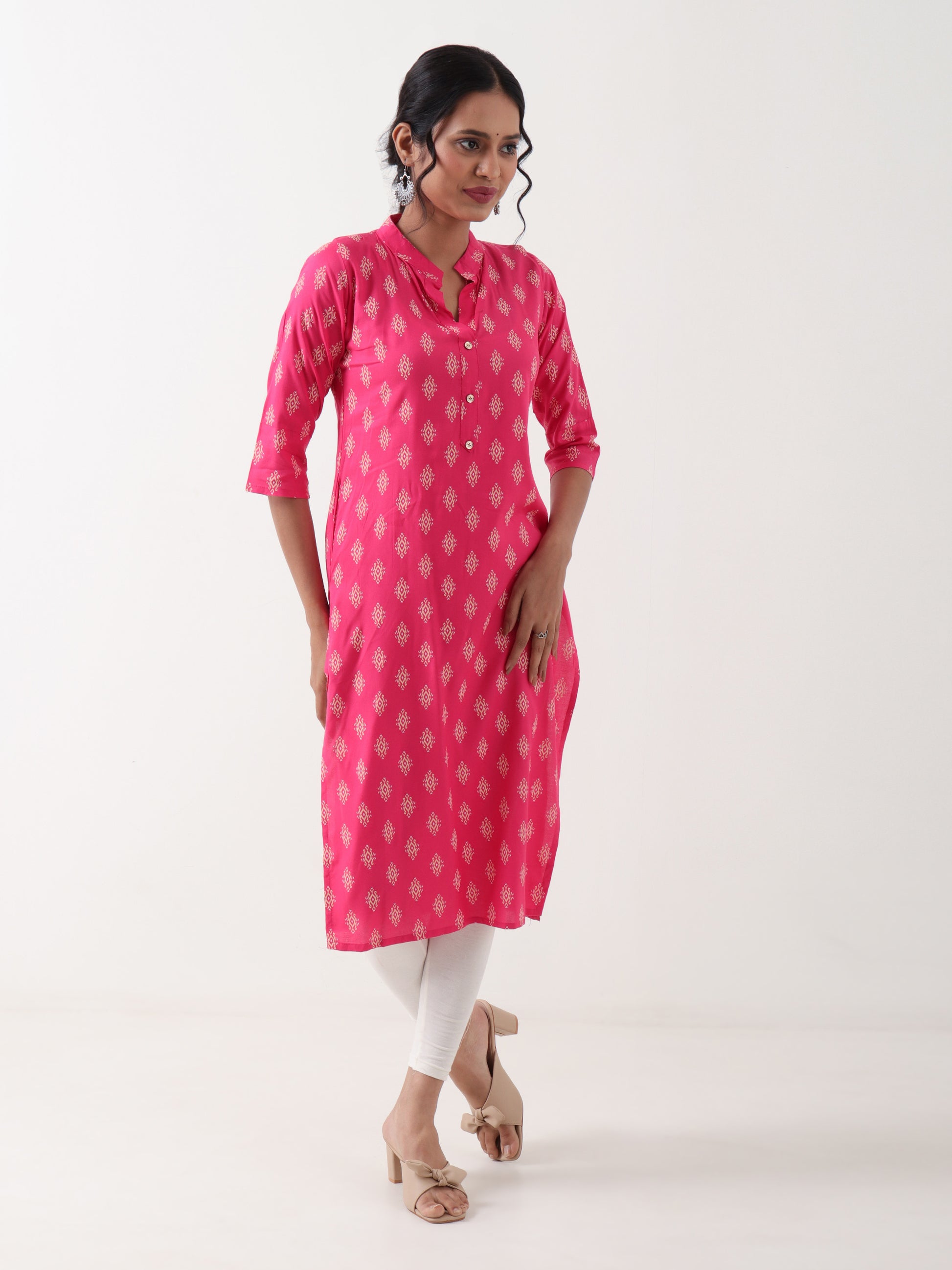 Tailored from breathable rayon, this pink A-line kurti is adorned with delicate golden prints that add a festive sparkle without overwhelming the look. The structured collar neck brings a touch of sophistication, while the three-quarter sleeves and calf-length hemline make it effortlessly wearable during warm weather.