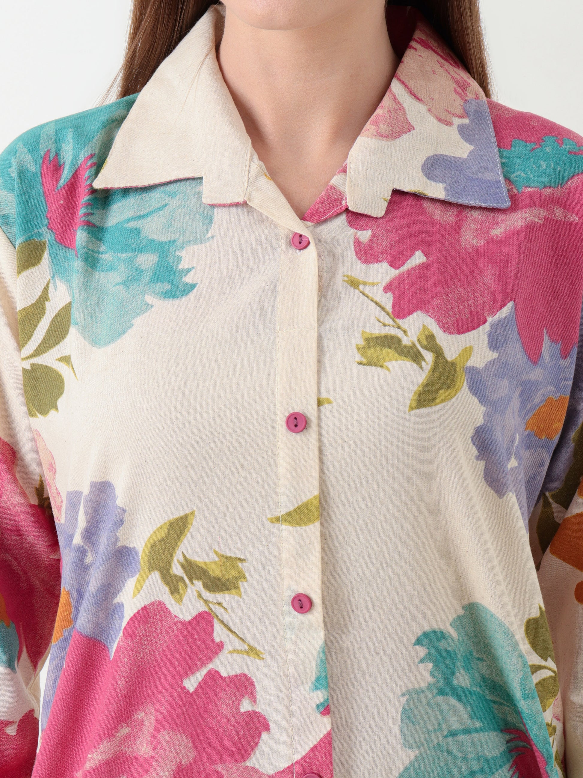 Designed on a soft white khadi cotton base, this co-ord set features a delicate floral print that evokes a breezy, feminine aesthetic. The above-the-knee top is tailored in an A-line silhouette with a collared neckline and three-quarter sleeves, lending a refined yet relaxed appeal.
