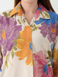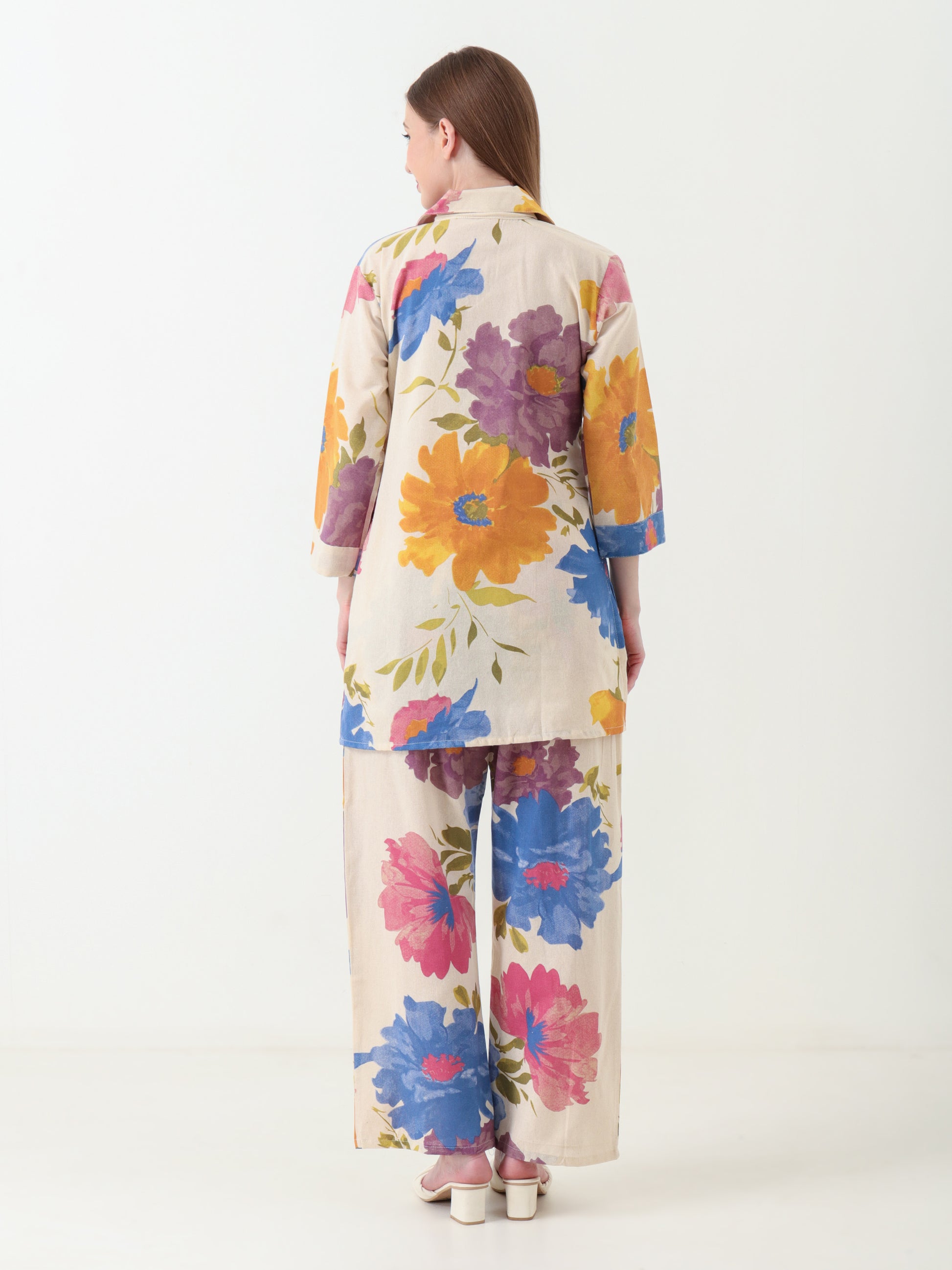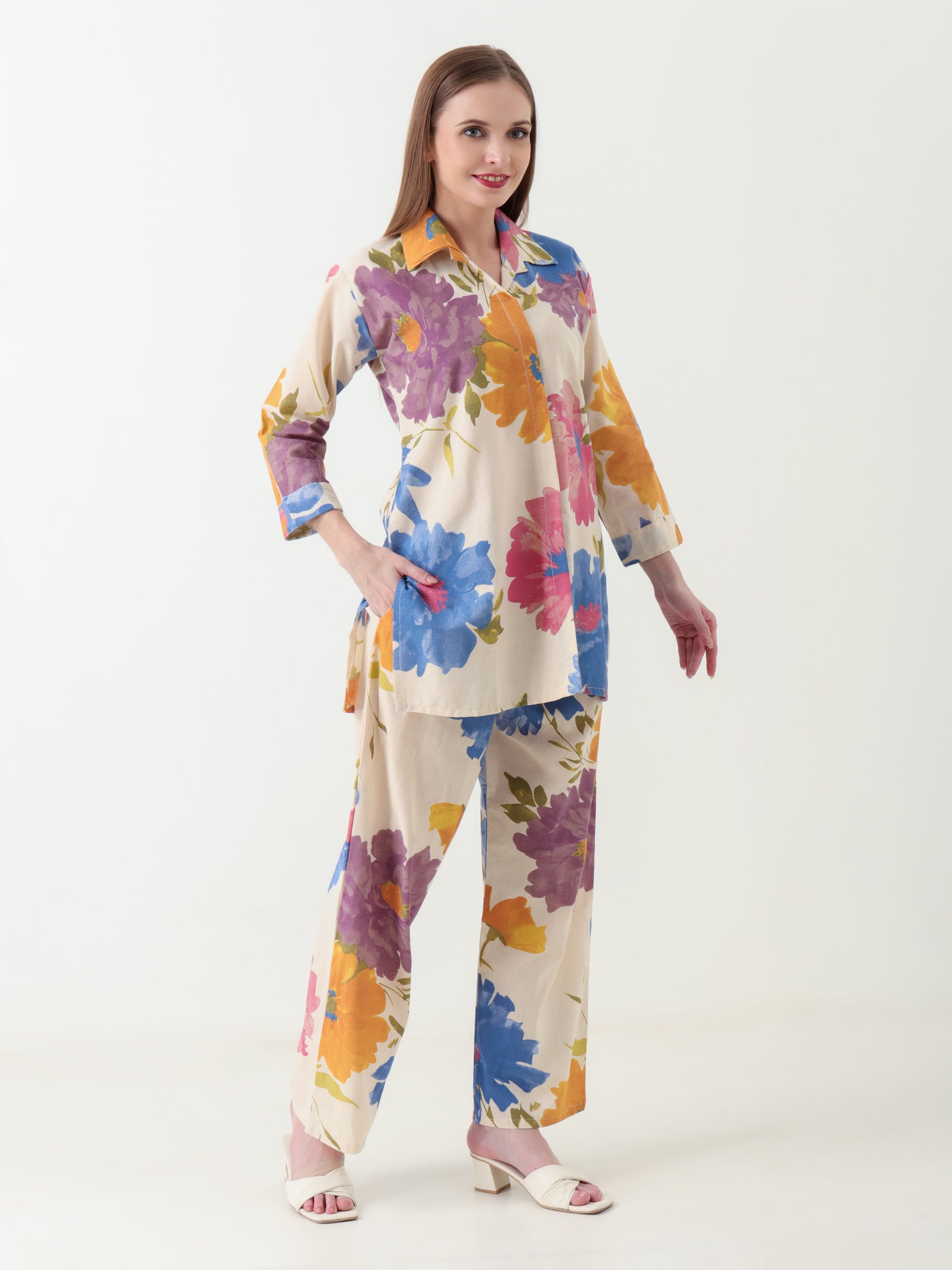 Crafted from breathable pure khadi cotton, this eye-catching co-ord set features large, expressive floral prints on a crisp white base, bringing a fresh and lively vibe to your summer wardrobe. The above-the-knee A-line top is designed with a smart collared neck and three-quarter sleeves, offering a tailored yet relaxed look.