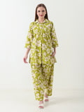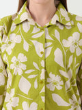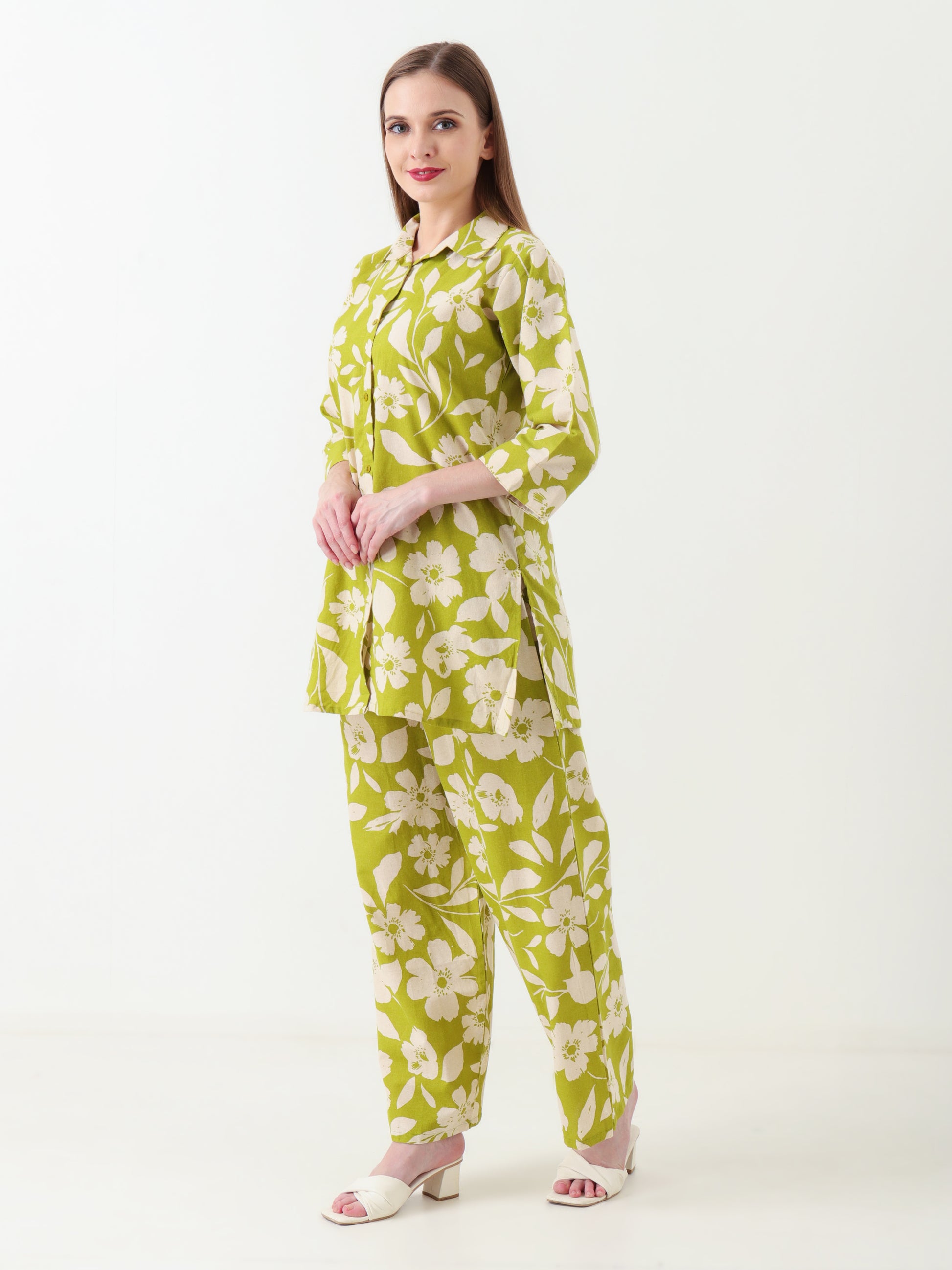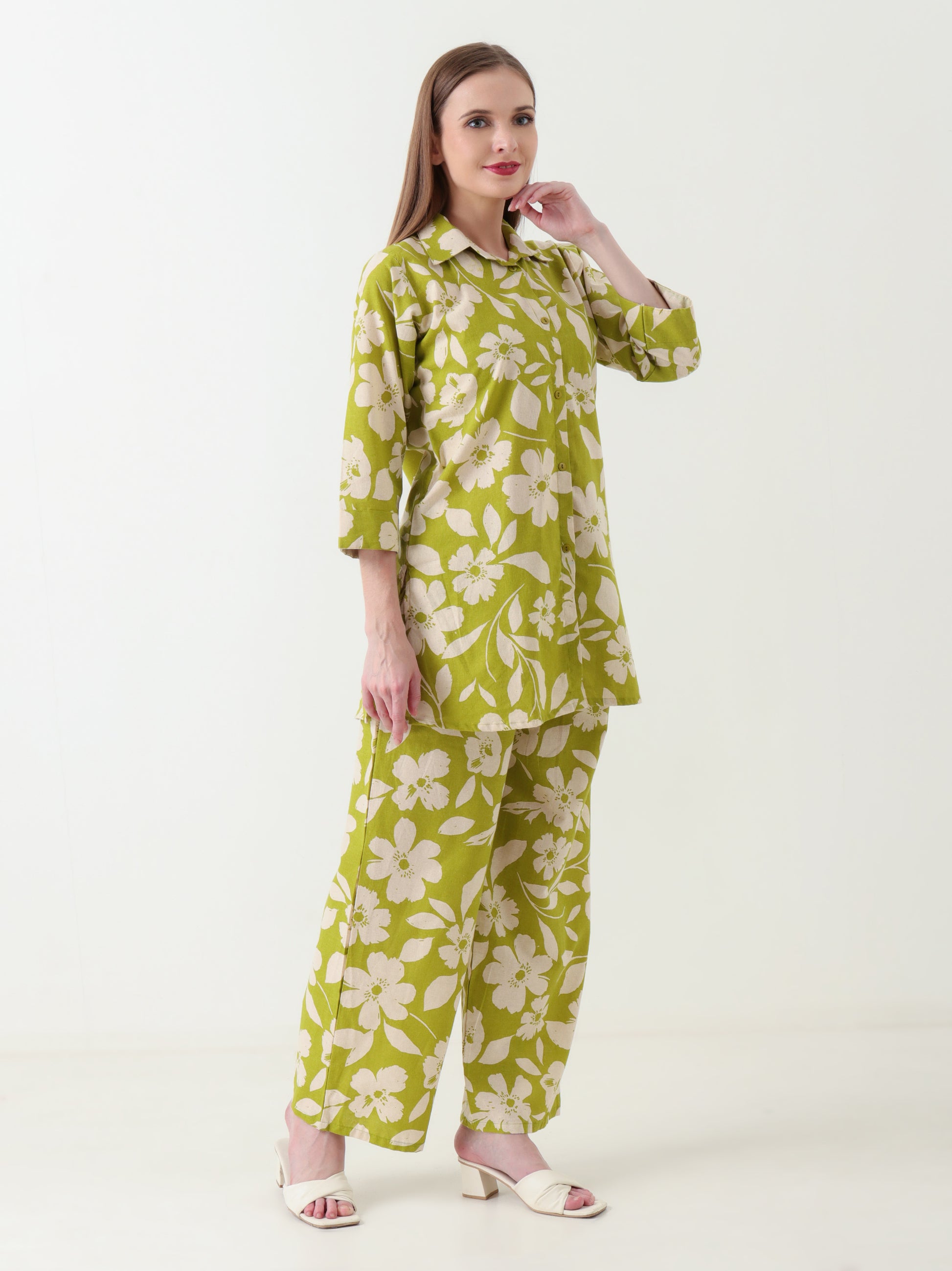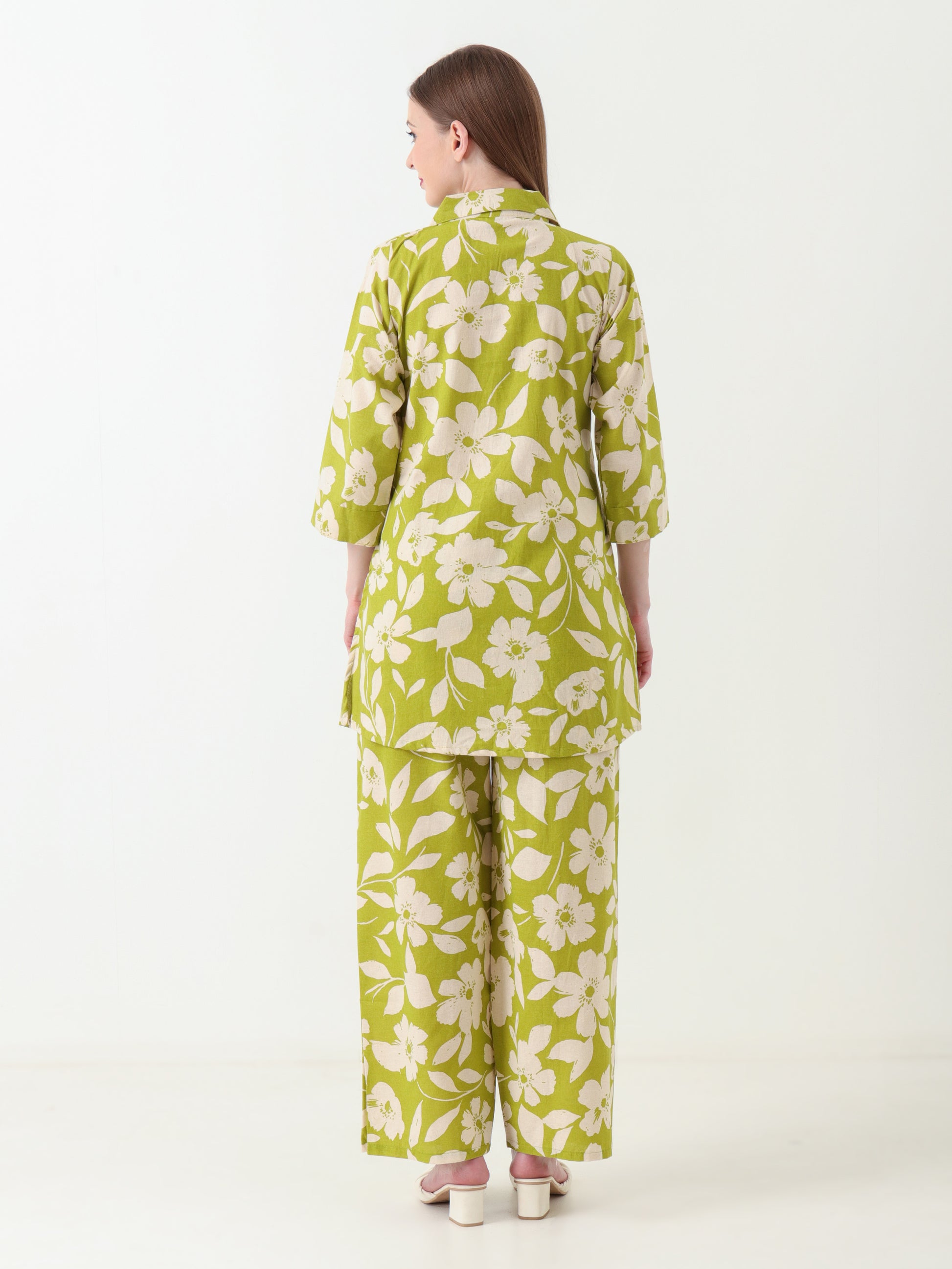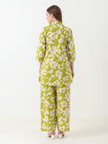 Paired with wide-leg palazzo pants in a coordinated print, this set is ideal for warm days, casual gatherings, or a chic everyday look. The Hina Green Blossom Co-ord Set is a harmonious blend of freshness, femininity, and functional style.