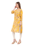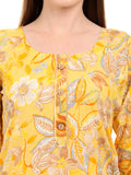Brighten your wardrobe with Varnnan's Sunshine Bloom A-Line Kurti. Crafted in a vibrant yellow hue, this calf-length kurti features delicate floral prints that exude warmth and charm. The A-line silhouette offers a flattering fit, while the round neckline and three-quarter sleeves provide classic elegance.