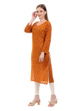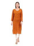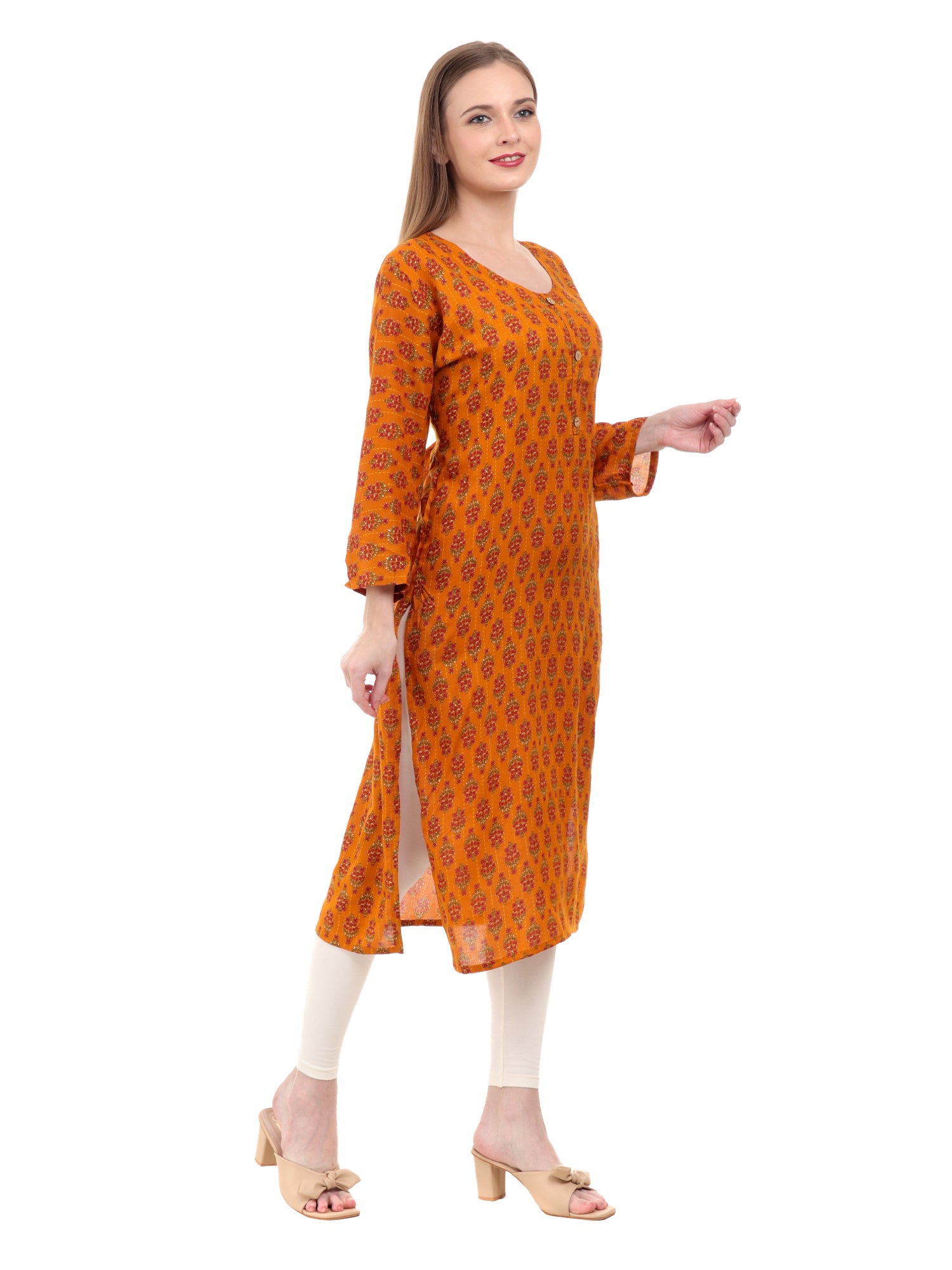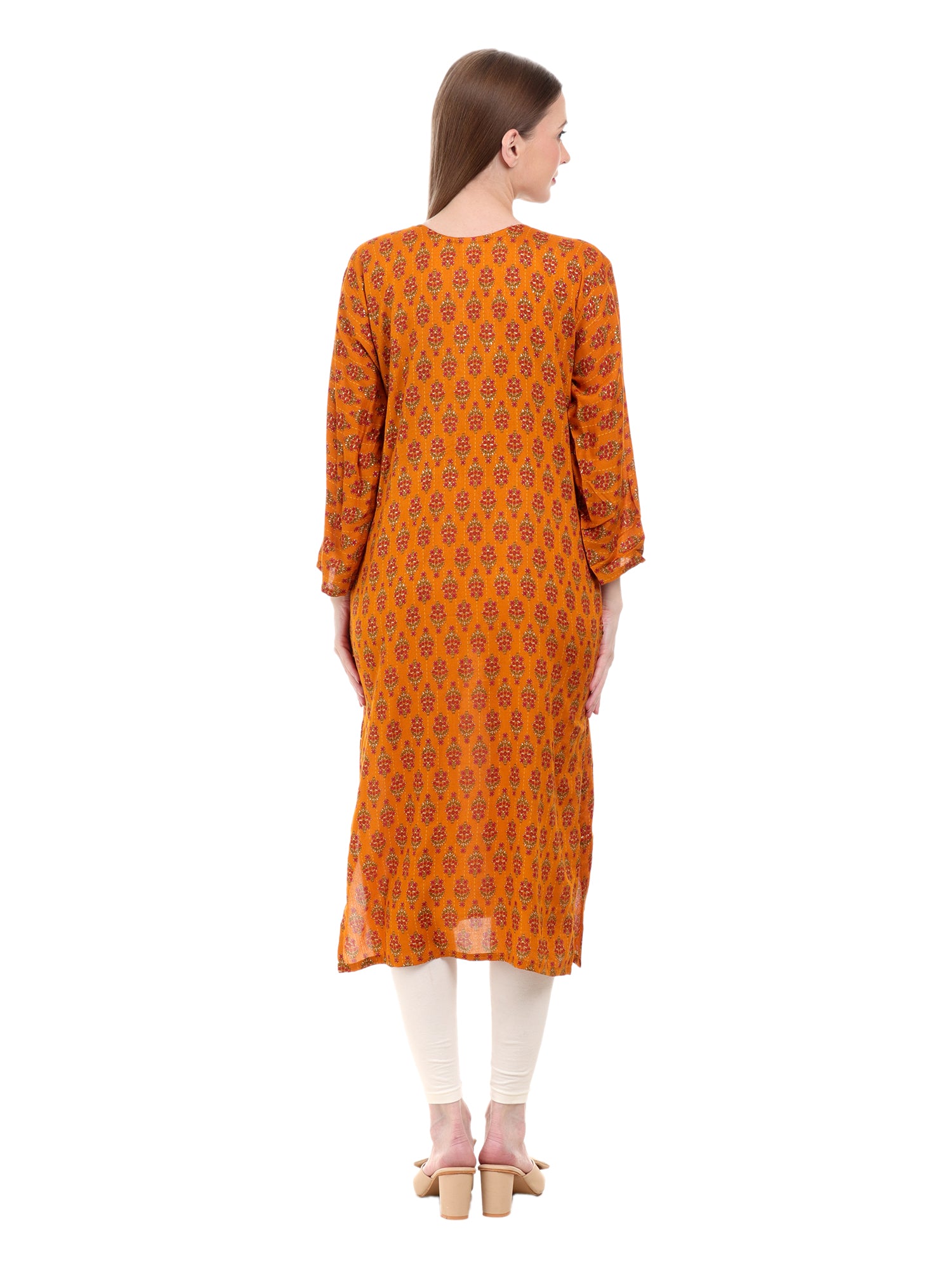 Embrace the warmth of earthy tones with Varnnan's Varnnan Mustard Leaf Whisper Kurti. Crafted in a rich dark mustard hue, this calf-length kurti features intricate prints that exude timeless charm. The A-line silhouette offers a flattering fit, while the round neckline and three-quarter sleeves provide classic elegance.