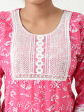 Drenched in a soft pink hue, this A-line calf-length kurti is a celebration of feminine charm and everyday sophistication. Adorned with delicate floral prints and a finely detailed embroidered round neckline, it exudes subtle grace rooted in traditional design.