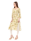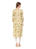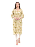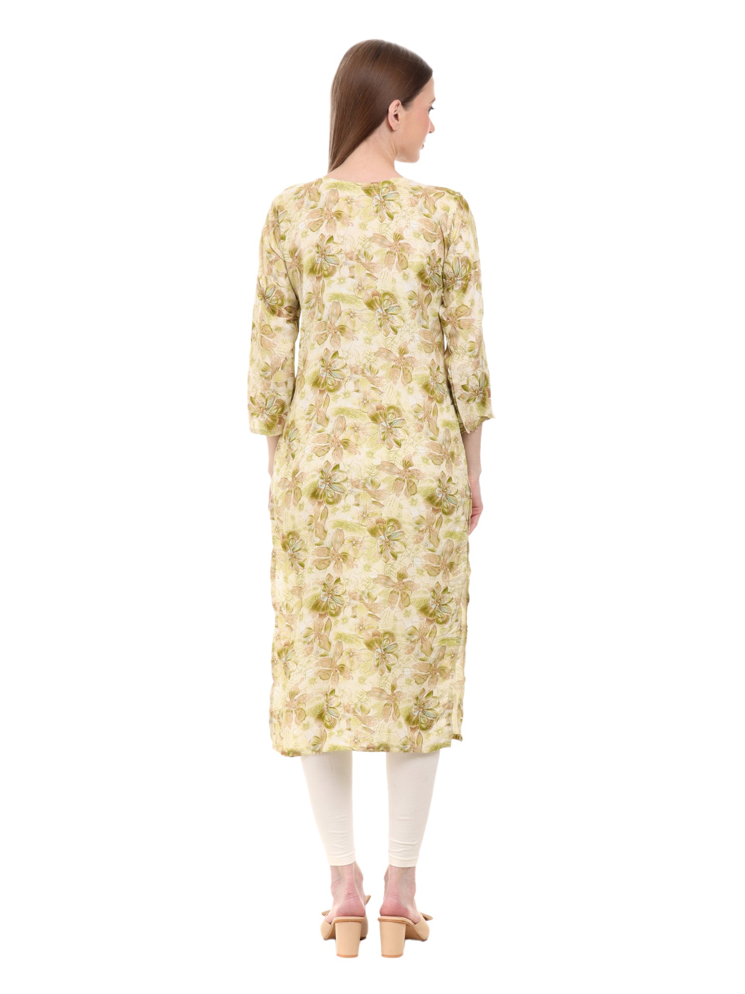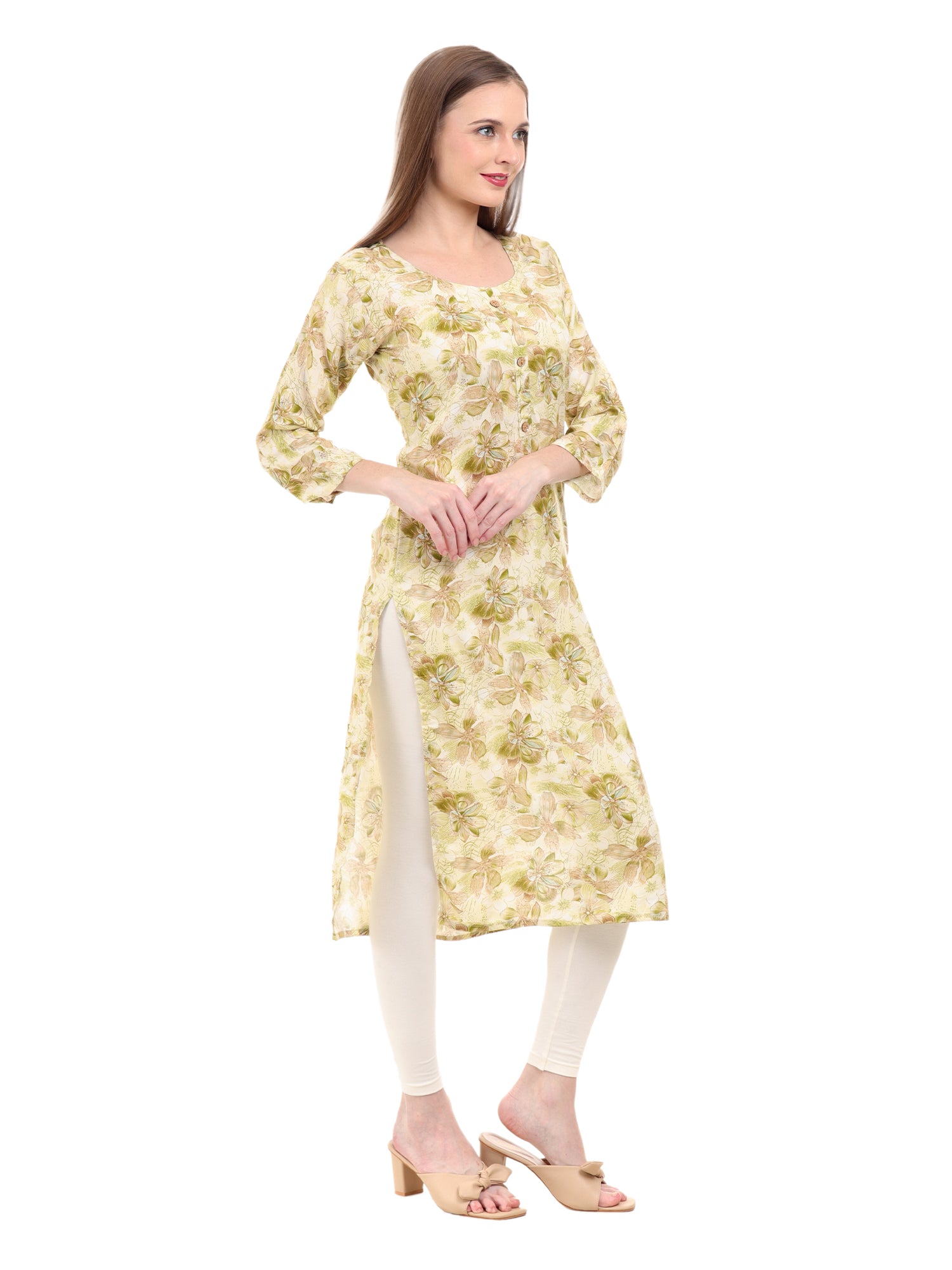Crafted from breathable Viscose Rayon fabric, this A-line calf-length kurti features a soft floral print in a serene white color combination, highlighted by a classic round neckline and three-quarter sleeves for an effortlessly feminine silhouette.